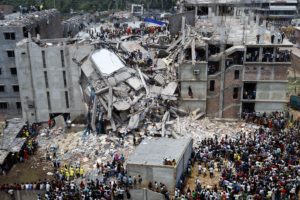 Le 24 avril 2013, à Savar (Bangladesh), le Rana Plaza, un immeuble de huit étages, s’est effondré en ensevelissant 1 127 personnes. Cet immeuble abritait des commerces et des entreprises de textile. La veille, des fissures avaient été détectées. Un ingénieur local avait alors recommandé de fermer le bâtiment jusqu’à la réparation des dommages. En dépit de cela, le 24 avril, il y avait plus de 3 000 personnes dans l’immeuble, pour la plupart des employées des usines textiles. Elles avaient été forcées de retourner au travail sous la menace de réductions de salaire. À contre-cœur, elles sont retournées sur leur lieu de travail à 8h45. À 9h00, s’est produite la première coupure d’électricité de la journée. Les groupes électrogènes situés sur le toit se sont mis en marche, créant comme d’habitude des vibrations dans tout l’immeuble. Ces oscillations étaient plus fortes que d’habitude, créant la panique chez les ouvrières. Elles ont essayé de sortir du bâtiment mais, avant qu’elles ne puissent atteindre la sortie, le plancher du dernier étage s’est effondré sur l’étage d’en dessous, qui s’est lui même effondré. En moins d’une minute, tout l’immeuble s’était effondré.