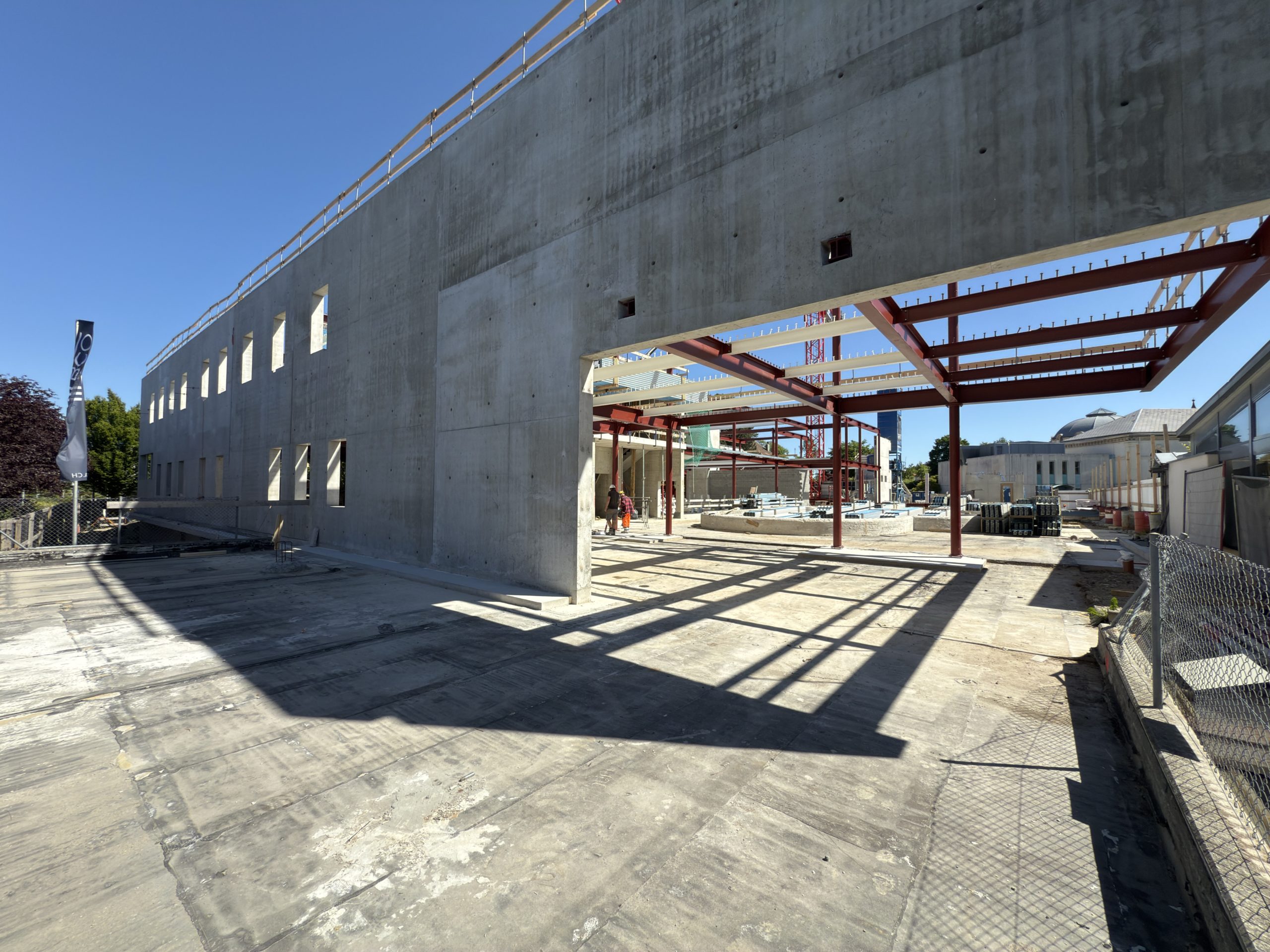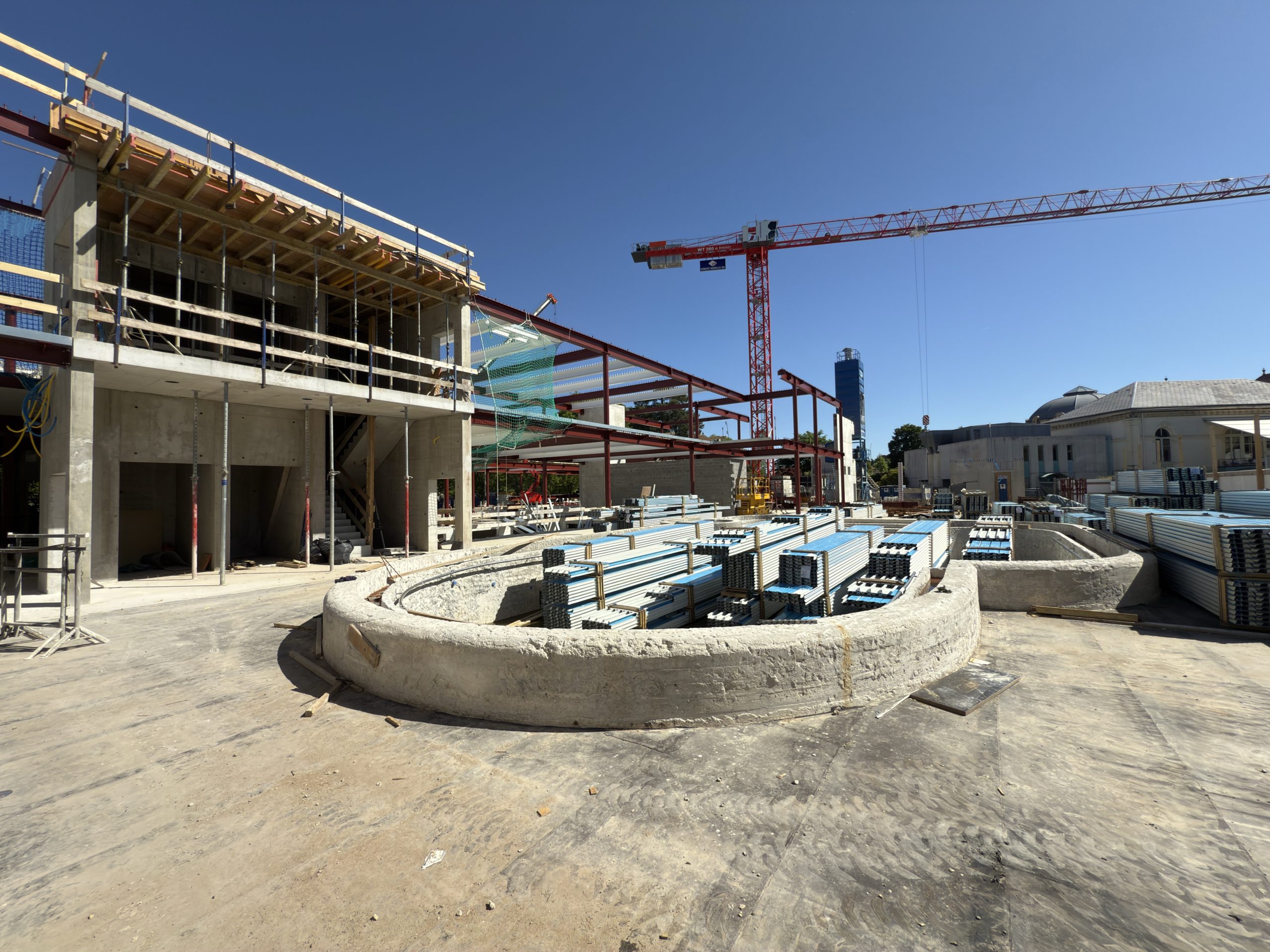 Une charpente métallique est en cours de montage. Parallèlement, la nouvelle cuisine doit être finalisée. Une fois celle-ci mise en service, l’ancienne – une extension inélégante des années 70 accolée maladroitement à la rotonde – sera démolie, ce qui permettra de lancer une campagne de pieux dans cette zone afin de réaliser la nouvelle entrée. La coordination précise de ces phases est essentielle.