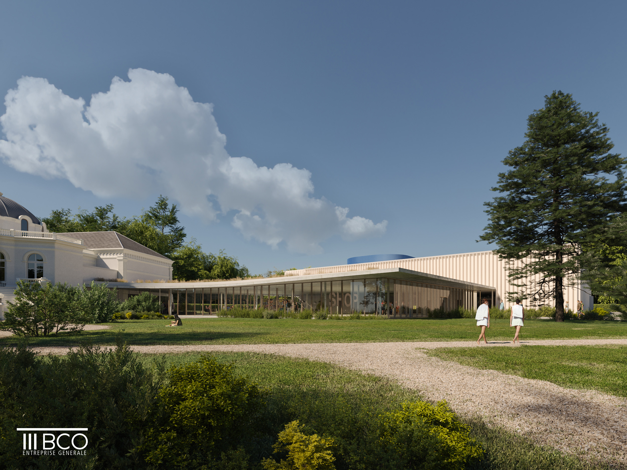 Une nouvelle entrée – un espace bas et transparent de 1000 m² – assure la liaison entre la partie hôtelière et le nouveau bâtiment des bains. Elle abritera l’accueil, la billetterie, ainsi qu’une boutique et un café, tout en offrant un dialogue inédit entre le parc, les bassins et la forêt historique classée qui entoure le site.