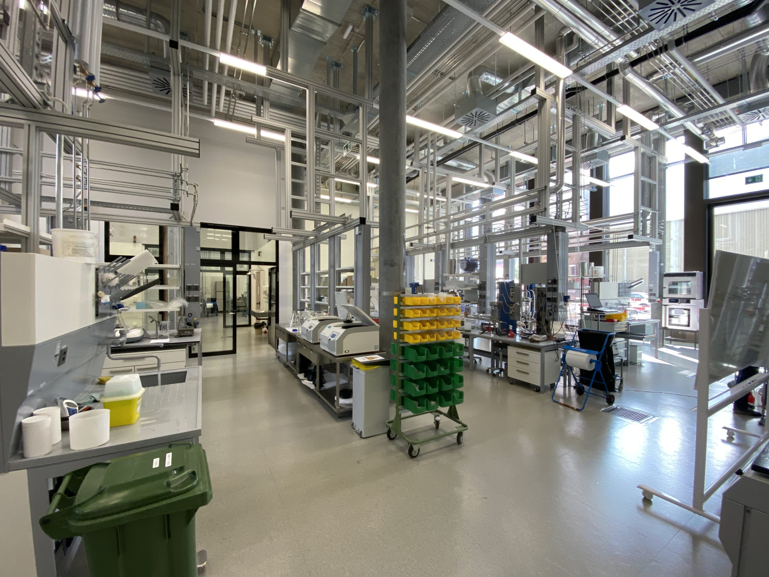 Les laboratoires nécessitent d’importantes installations techniques. Ici, tous les réseaux sont volontairement laissés apparents. Là encore, les futures modifications sont facilitées. Dans les étages, quatre gaines regroupent les flux et permettent de libérer les plafonds de tout élément technique. L’ensemble est relié au chauffage à distance de la ville, la distribution chaud/froid se fait par dalles actives. Une grande partie des toitures est couverte de panneaux photovoltaïques dont la production est destinée à la consommation directe des bâtiments. Parmi eux, quelque 200 m2 sont à usage de la HES-SO qui, dans le cadre de ses recherches, les utilise pour développer des panneaux ou des concentrateurs.