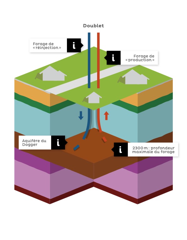 Un doublet géothermique sera réalisé, constitué par deux forages qui sont déviés et distants de 1,5 kilomètre en fin de forage. Pour valoriser la chaleur, deux boucles sont ainsi créées, chacune en circuit fermé et indépendantes l’une de l’autre. La première incombe à la société EnergeÔ et est appelée « boucle géothermale », elle prélève la chaleur depuis l’aquifère du Dogger grâce au puits de production, la transfère ensuite dans un échangeur de chaleur, avant d’être restituée dans le même aquifère grâce au puits de réinjection. La deuxième boucle, appelée « boucle géothermique », incombe à la société ThermorésÔ, qui achemine la chaleur ainsi transférée au travers de l’échangeur directement vers les consommateurs.