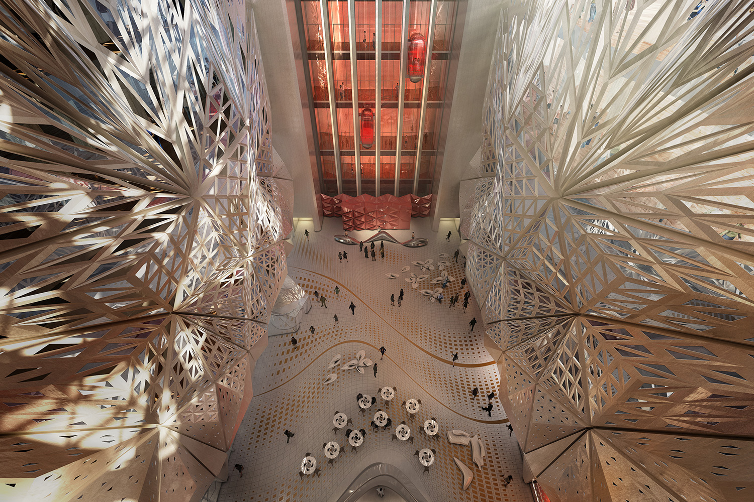 Les ingénieurs ont imaginé une structure maillée complexe qui confère du dynamisme à l’extérieur de la tour tout en produisant une esthétique intérieure agréable en réduisant le besoin de support structurel interne, créant ainsi de vastes espaces intérieurs libres de porteurs. L’enveloppe complexe est également visible de l’intérieur du bâtiment, conférant une beauté saisissante au vaste hall d’entrée de 40 mètres de haut et l’inondant de lumière naturelle.