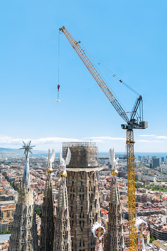 Contribuer à une œuvre si emblématique que la basilique de la Sagrada Familia, en construction depuis plus de 140 ans, n’est pas une expérience que l’on peut vivre au quotidien. Pour réaliser ce projet, on a choisi les grues à flèche relevable Liebherr 710 HC-L et 125 HC-L, dont l’essentiel du travail constituera à terminer la Torre Jesús, principale tour du temple qui atteindra 172 mètres de haut. Le fait qu’elles soient relevables et leur adaptation aux exigences du travail ont été des facteurs déterminants qui ont conduit la Sagrada Familia à opter pour ce type d’équipement.