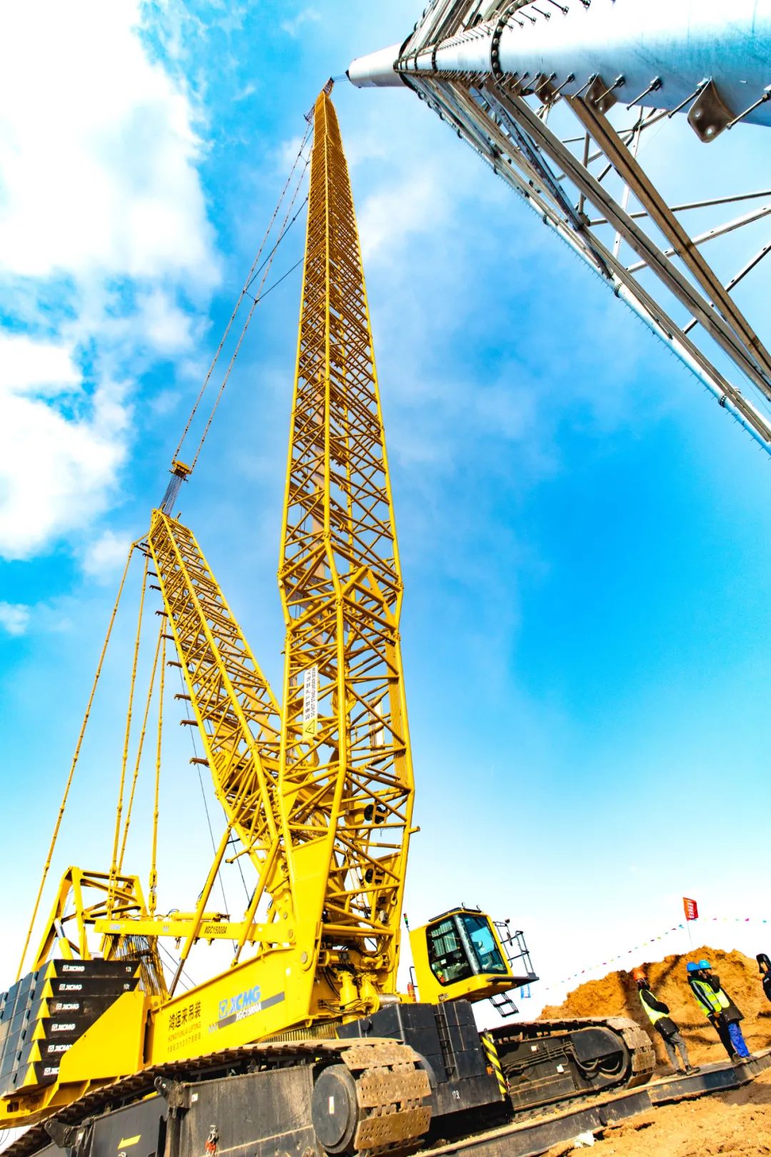 Une éolienne de 4,5 mégawatts a été mise en place sur un nouveau parc éolien chinois. La hauteur de la tour atteint 180 mètres, ce qui la place dans la tranche des plus élevées parmi les éoliennes sur terre. Pour la mise en place de la pale, une grue sur chenilles de XCGM a été mise à contribution. Le site est un terrain plat et ouvert, fortement exposé au vent; un défi supplémentaire pour la grue. Le monitoring du vent a permis de d’effectuer le levage et la mise en place dans une brève fenêtre « sans vent ». Cette opération fait de la XGC15000A la première grue sur chenilles éolienne au monde à atteindre une hauteur de levage de 180 mètres.
