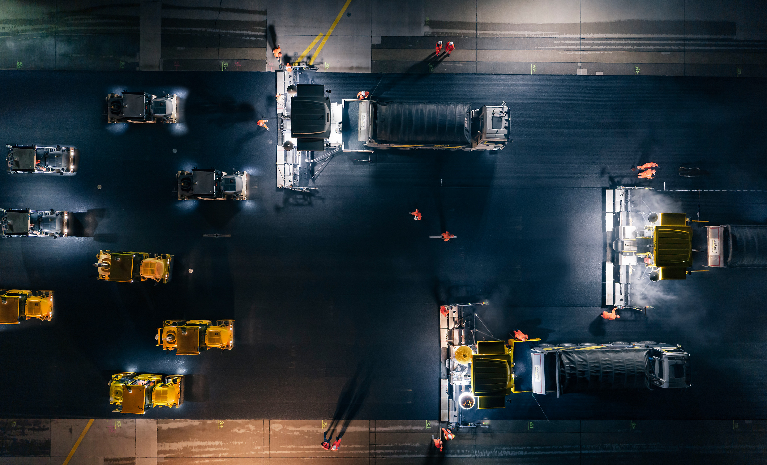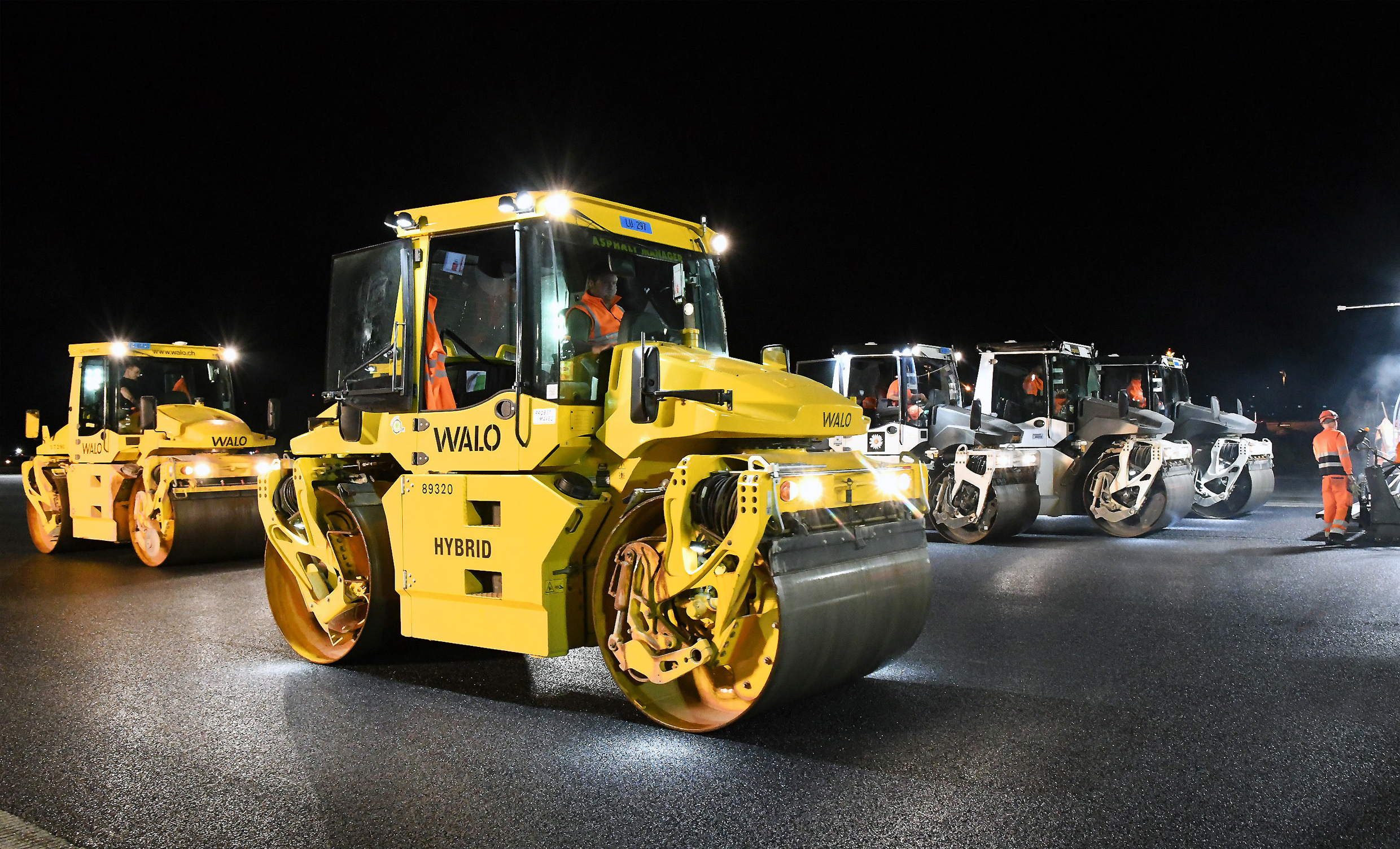 Ces nuits-là, vers 2h15, huit rouleaux tandem BOMAG quadrillaient la surface. Ces engins BOMAG (BW 174 AP-4 AM Hybrid et BW 174 AP-4 AM) étaient équipés du système de compactage à régulation automatique Asphalt Manager. Grâce à Asphalt Manager, le compactage a été réalisé avec puissance et rapidité.