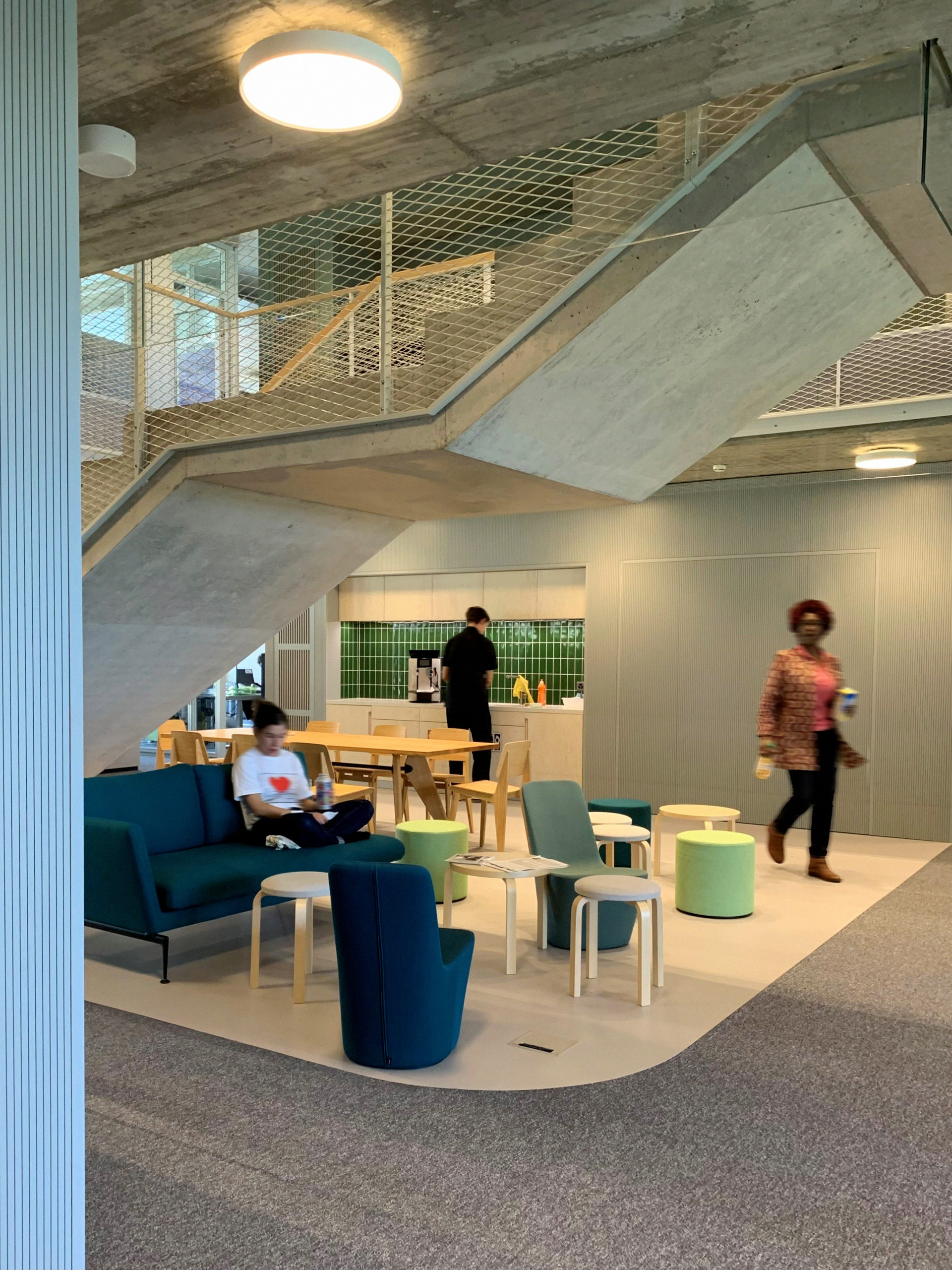 Quatre noyaux béton, contenant trois ascenseurs, un monte-charges et deux escaliers de secours, traversent les huit niveaux hors sol. Dans les bureaux, les escaliers ne sont pas continus. Placés à différents endroits du plan, ils génèrent une promenade architecturale à travers les étages. Ils deviennent ainsi un vecteur de dynamisme et d’échange entre les équipes. Un restaurant, également ouvert au public, est situé au rez-de-chaussée, alors qu’une grande cafétéria et un point de restauration sont placés respectivement au septième étage et en toiture.
