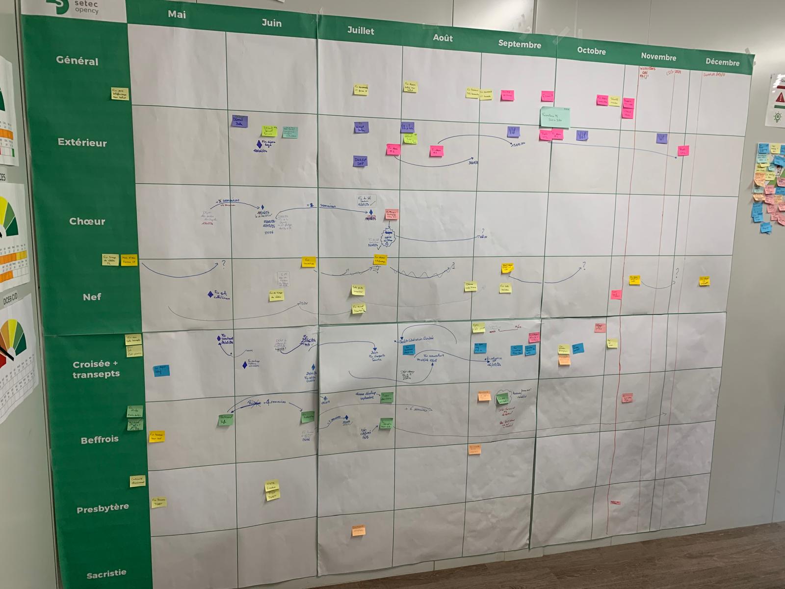 Suite à l’incendie qui a ravagé la cathédrale Notre-Dame de Paris et à la décision de la reconstruire à l’identique, la société setec opency, filiale du groupe setec, a été chargée par l’établissement public Rebâtir Notre-Dame de Paris de la planification, de la coordination et du pilotage général du projet. Une planification rigoureuse et détaillée de toutes les phases, ainsi qu’une gestion de l’espace incluant la coordination de tous les acteurs, ont été mises en place en vue d’une réouverture prévue fin 2024. Le modèle de pilotage du Lean Construction a été un facteur déterminant pour relever ce défi.