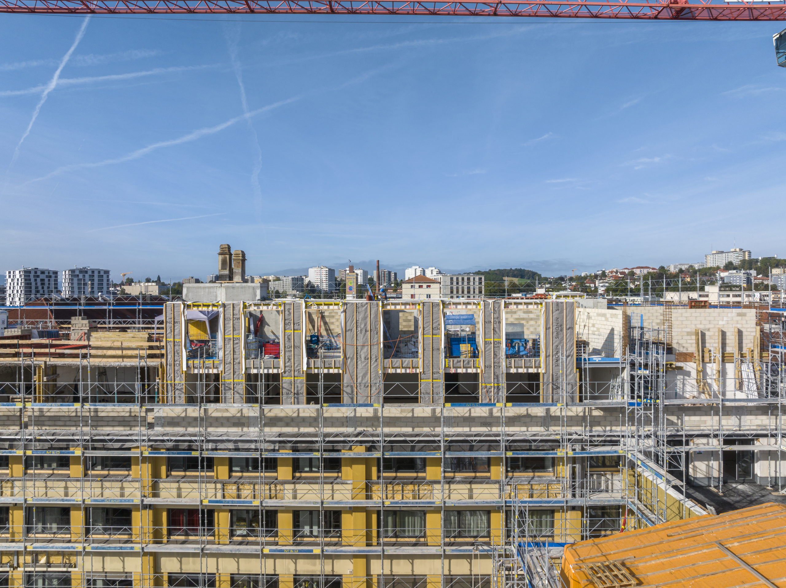 La surélévation a pour particularité de privilégier un mix bois-béton. Cette nouvelle structure est réalisée par Induni & Cie SA qui rehausse les noyaux principaux en béton armé (cages d’escaliers, murs de refend et gaines d’ascenseurs) avant de mettre en place les éléments en ossatures bois fournis par la société Simonin SA. La structure existante des étages inférieurs a été renforcée ponctuellement. (PKE)