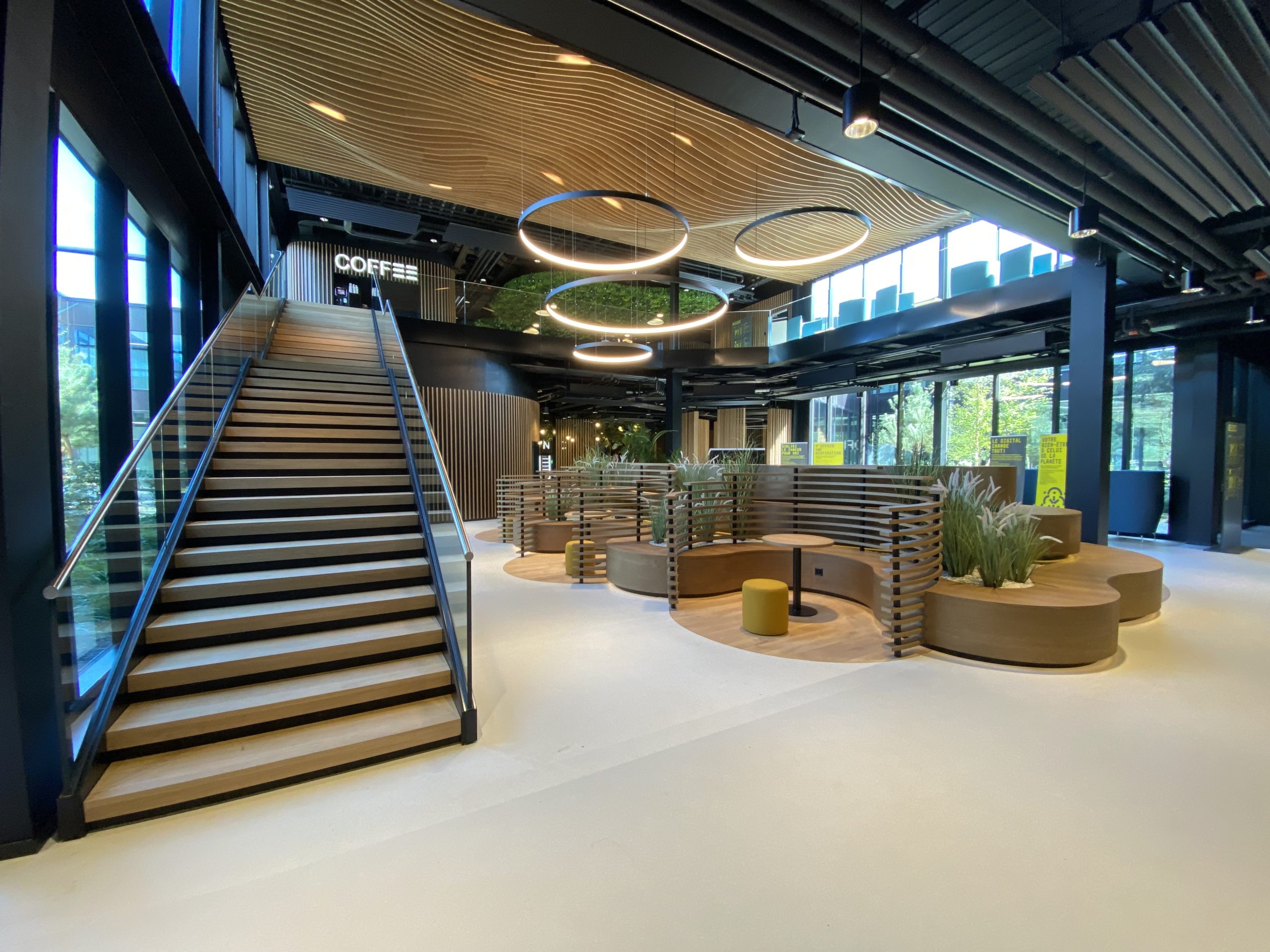 Le bâtiment propose 650 m2 de surfaces communes sur une superficie totale de 10000 m2, répartie sur deux étages. Ces espaces collaboratifs sont mis à disposition des locataires afin de mutualiser les coûts et faire converger économie, synergies et préservation de l’environnement. Salles de conférence et de détente, espaces verts, salles de sport et restaurants se côtoient au sein de cet espace partagé, pensé comme le cœur du bâtiment. Les espaces mutualisés et les surfaces communes permettent ainsi à chaque locataire d’économiser des mètres carrés de location et d’optimiser son loyer pour la production.