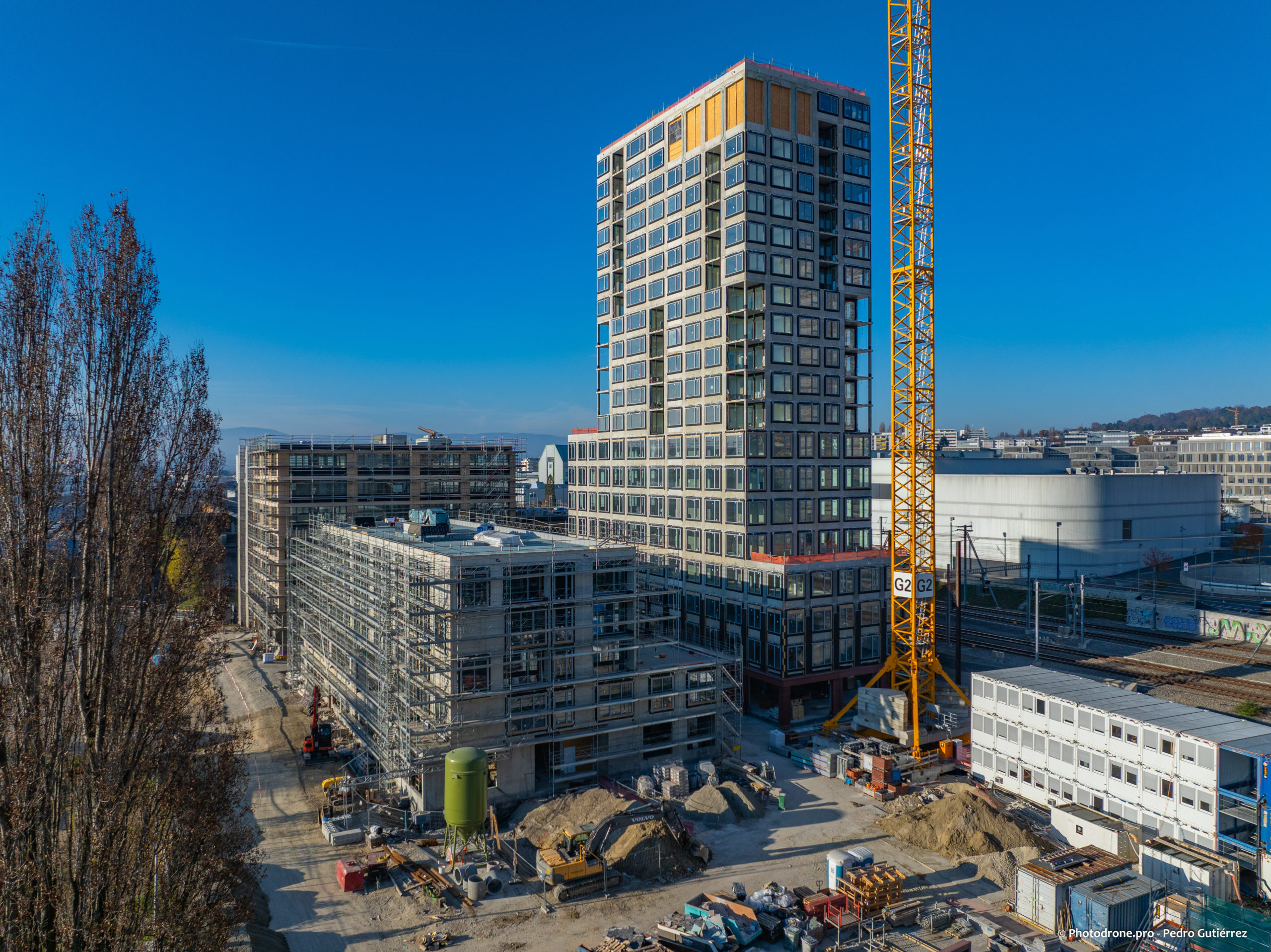 Les doubles hauteurs ajoutent une dynamique verticale qui souligne l’élancement de la tour. Les éléments préfabriqués sont montés sans échafaudage, mettant en œuvre des méthodes de construction innovantes.