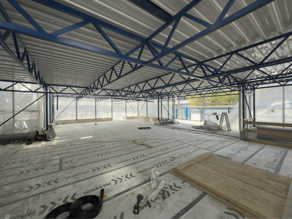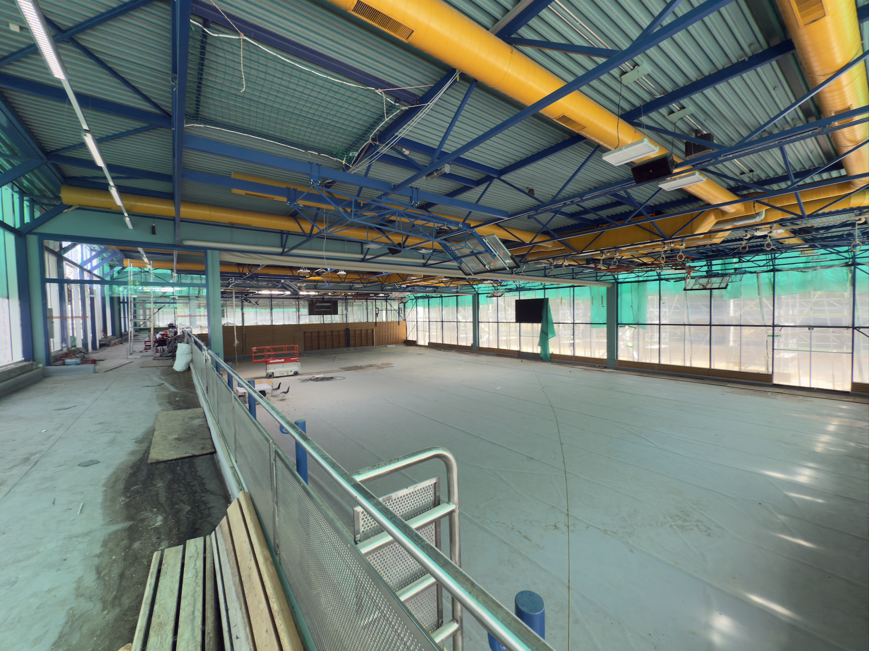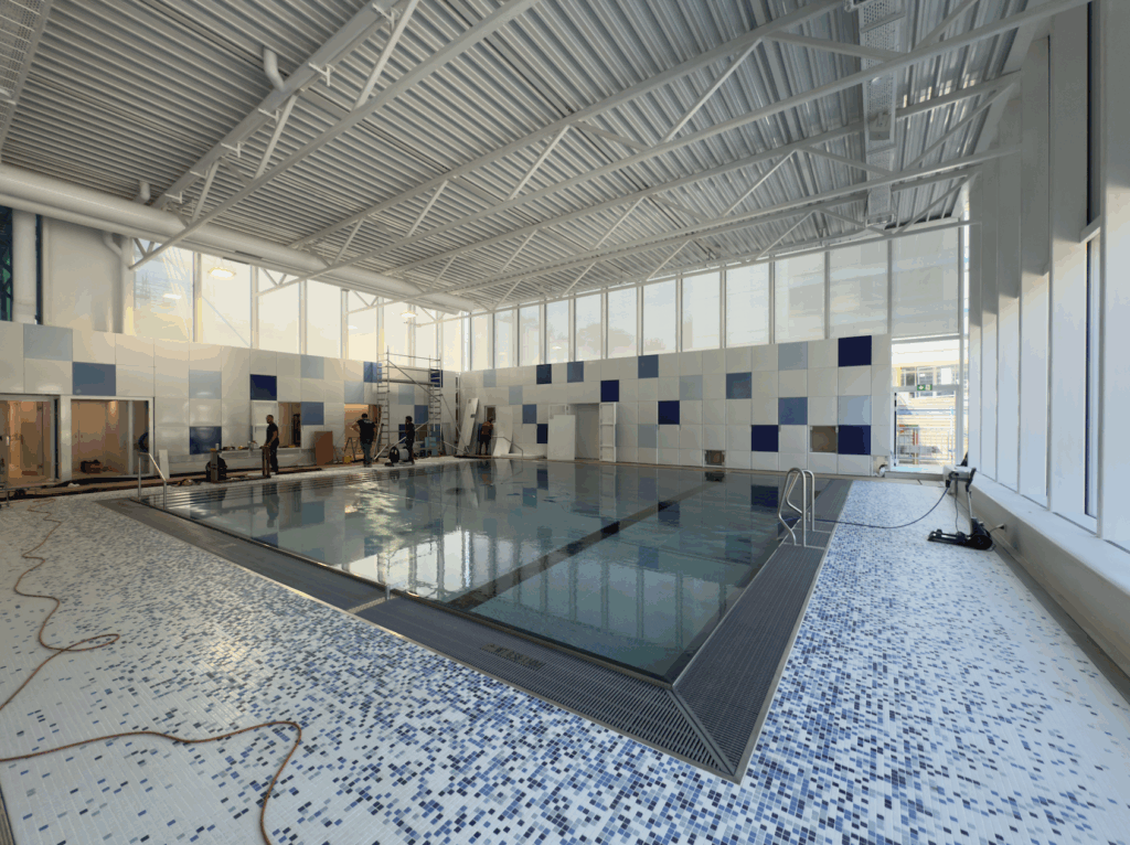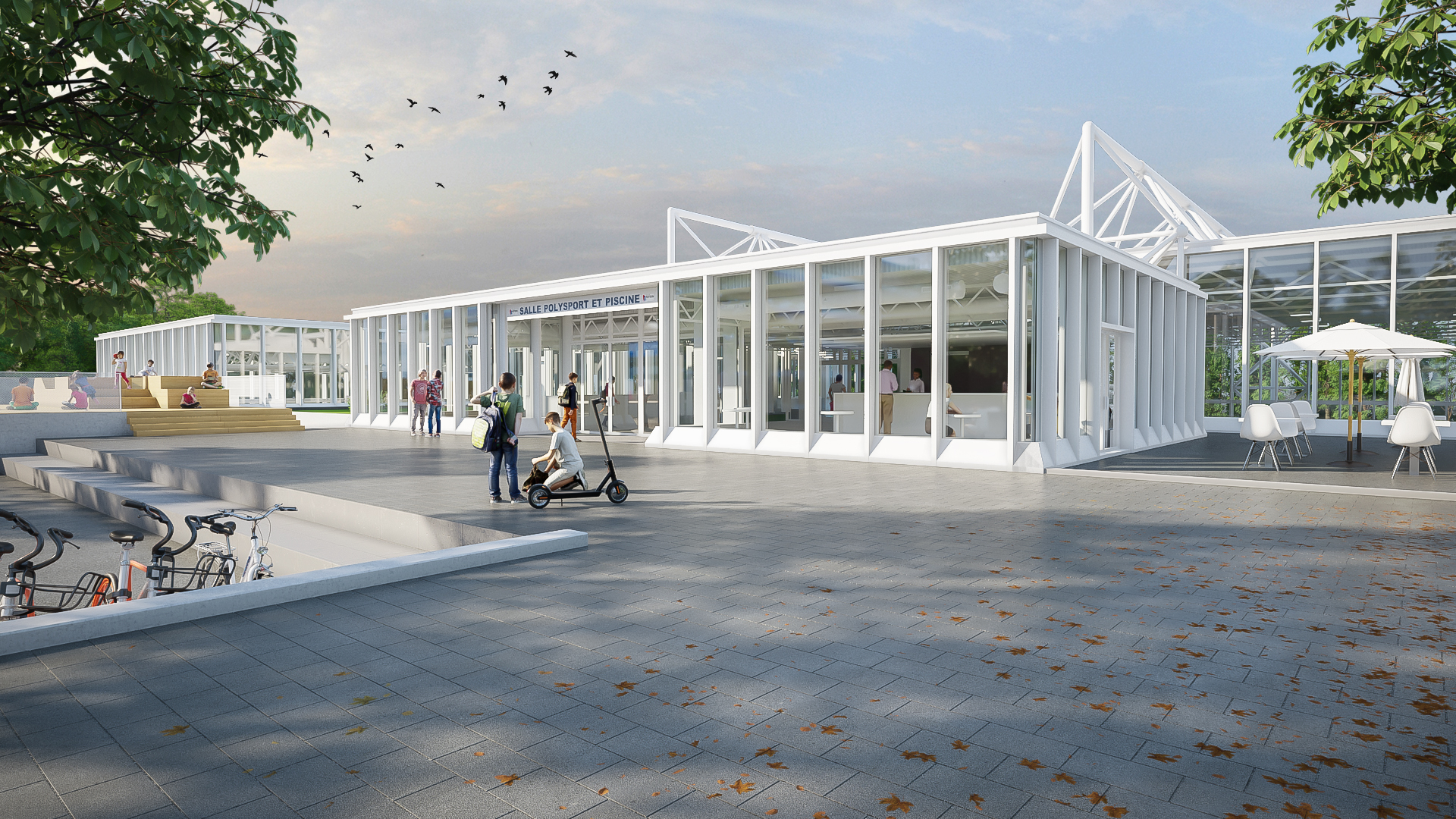 Le projet concerne les trois bâtiments du centre : le pavillon d’entrée, la salle polysport et la piscine. Cette dernière nécessite les travaux les plus importants et avancés. Toute la partie émergée du bâtiment a été démolie et remplacée par une nouvelle structure métallique. Les deux autres volumes reçoivent une nouvelle façade mais leur structure n’est pas modifiée.