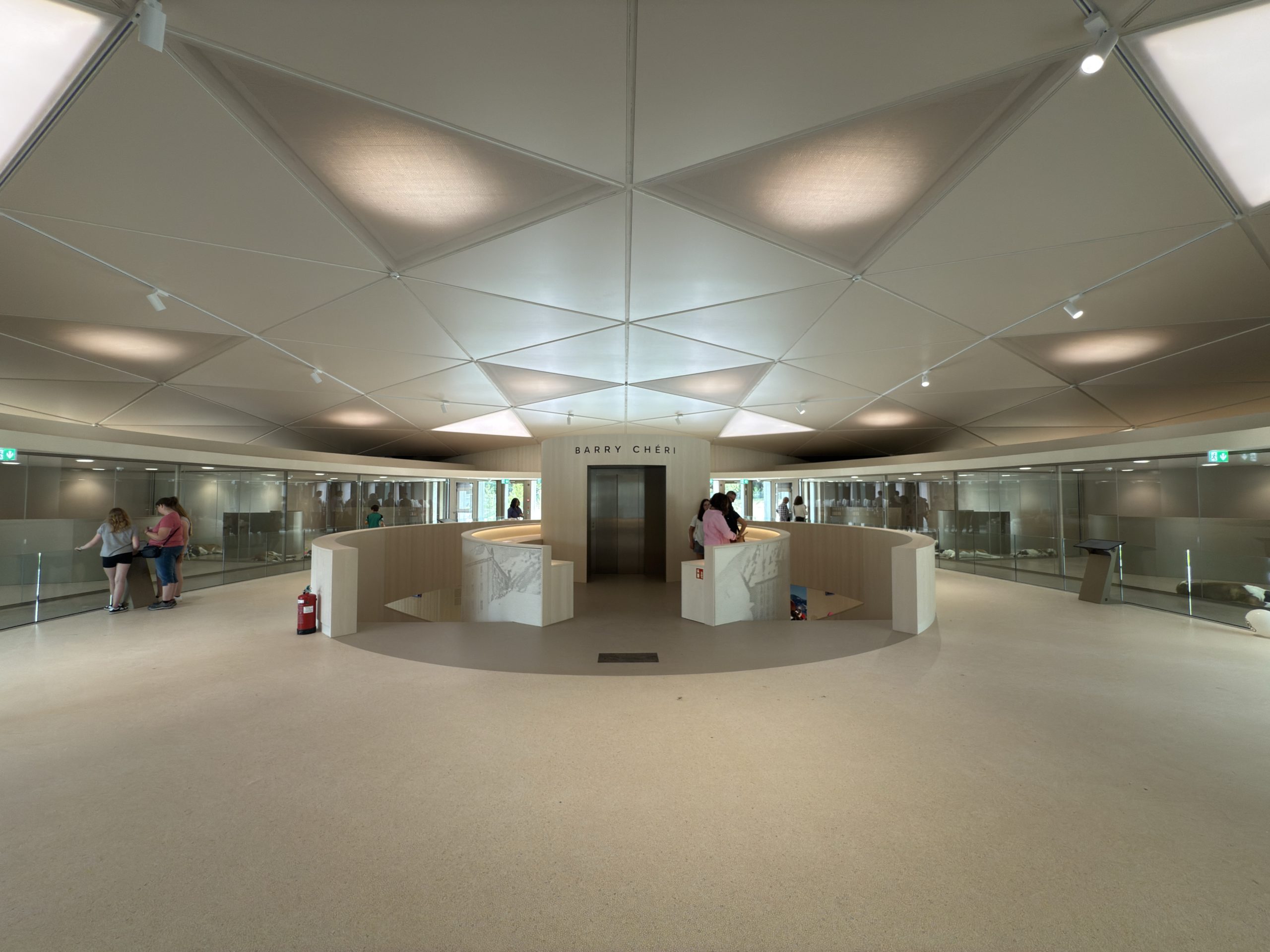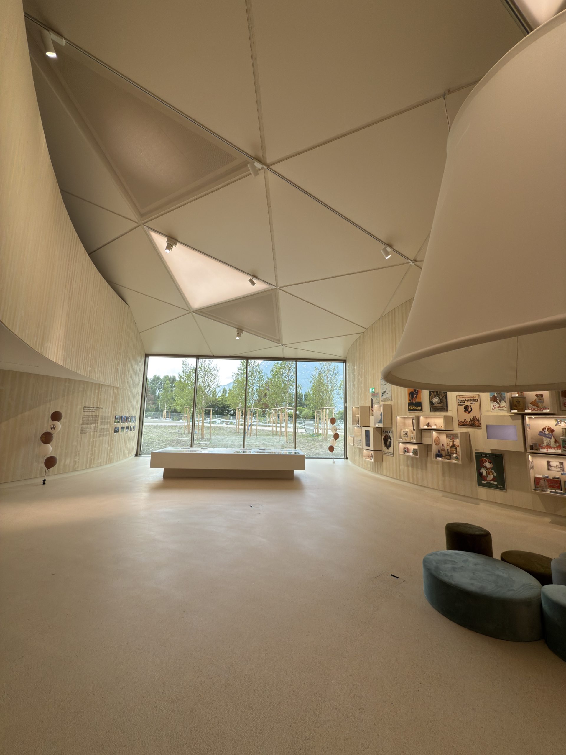 L’intérieur du musée est baigné de lumière naturelle. Les surfaces verticales sont revêtues de lames de bois clair dont le rythme dialogue avec les empreintes de coffrages présentes sur le béton. La fluidité des espaces est accompagnée par un sol sans joints. Des noyaux de cerise sont ajoutés à la résine blanche. Une fois poncés, les noyaux deviennent un motif organique à la fois discret et structurant.