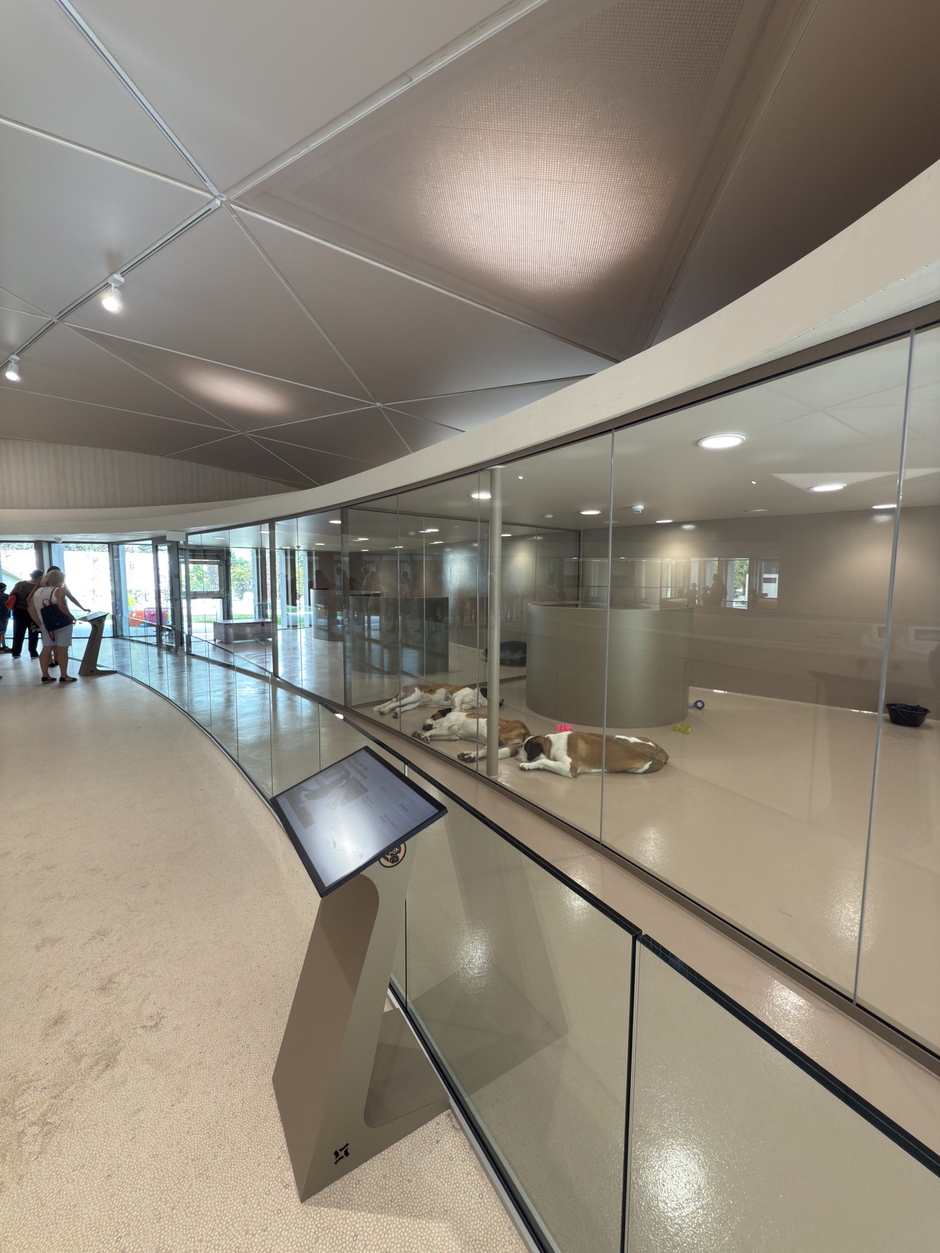 Un double escalier mène au niveau supérieur. Son habillage en tôles perforées évoquant l’ascension vers l’hospice, du côté suisse et du côté italien. En haut, c’est l’espace du vivant. De vastes box vitrés permettent aux visiteurs d’admirer les chiens. Ces derniers peuvent trouver un peu de privacy derrière les murs ondulés qui séparent ces espaces et peuvent accéder aux zones extérieures dont les aménagements incluent des éléments naturels représentatifs du paysage valaisan, tels que zones morainiques et forêts d’altitude. C’est aussi ici que leur sont prodigués des soins qui vont du brossage régulier à de la physiothérapie en bassin et sur tapis roulant. Barryland est également un lieu de formation pour les futurs gardiens d’animaux.