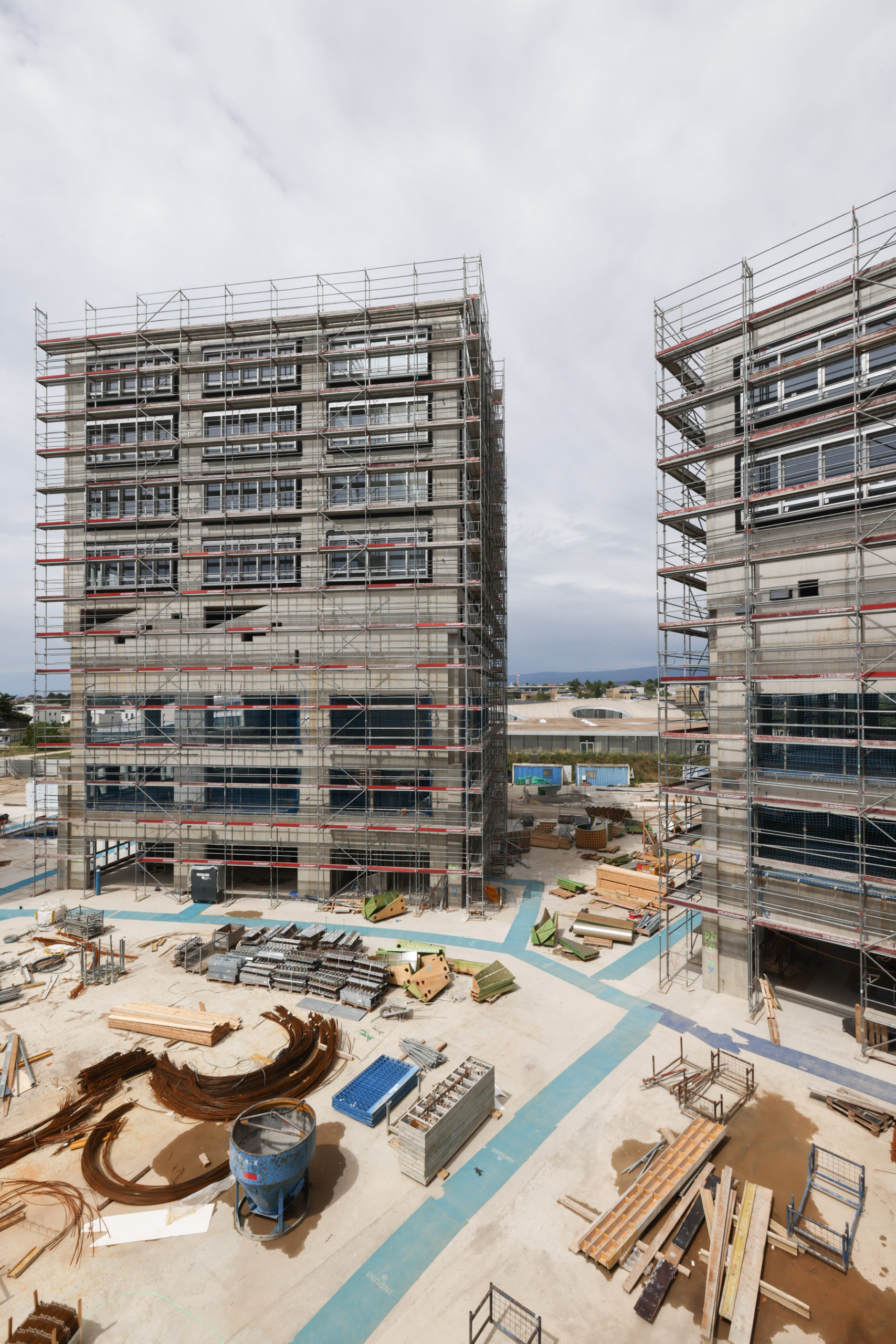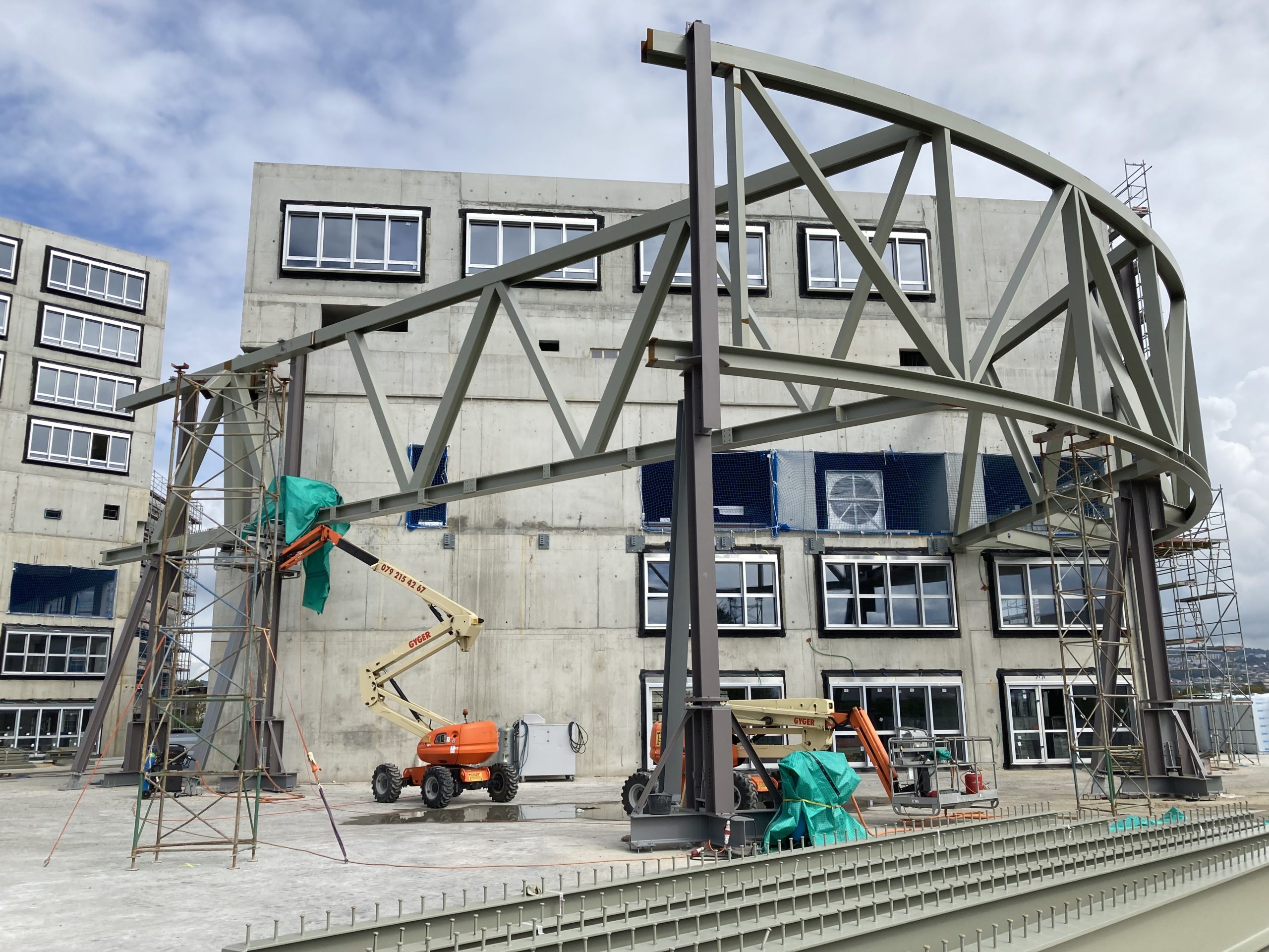 L’ensemble totalise 2000 tonnes de charpente dont 1000 tonnes de poutres principales, 500 tonnes de poutres de plancher et 350 tonnes pour la toiture. La charpente est actuellement en phase de montage.