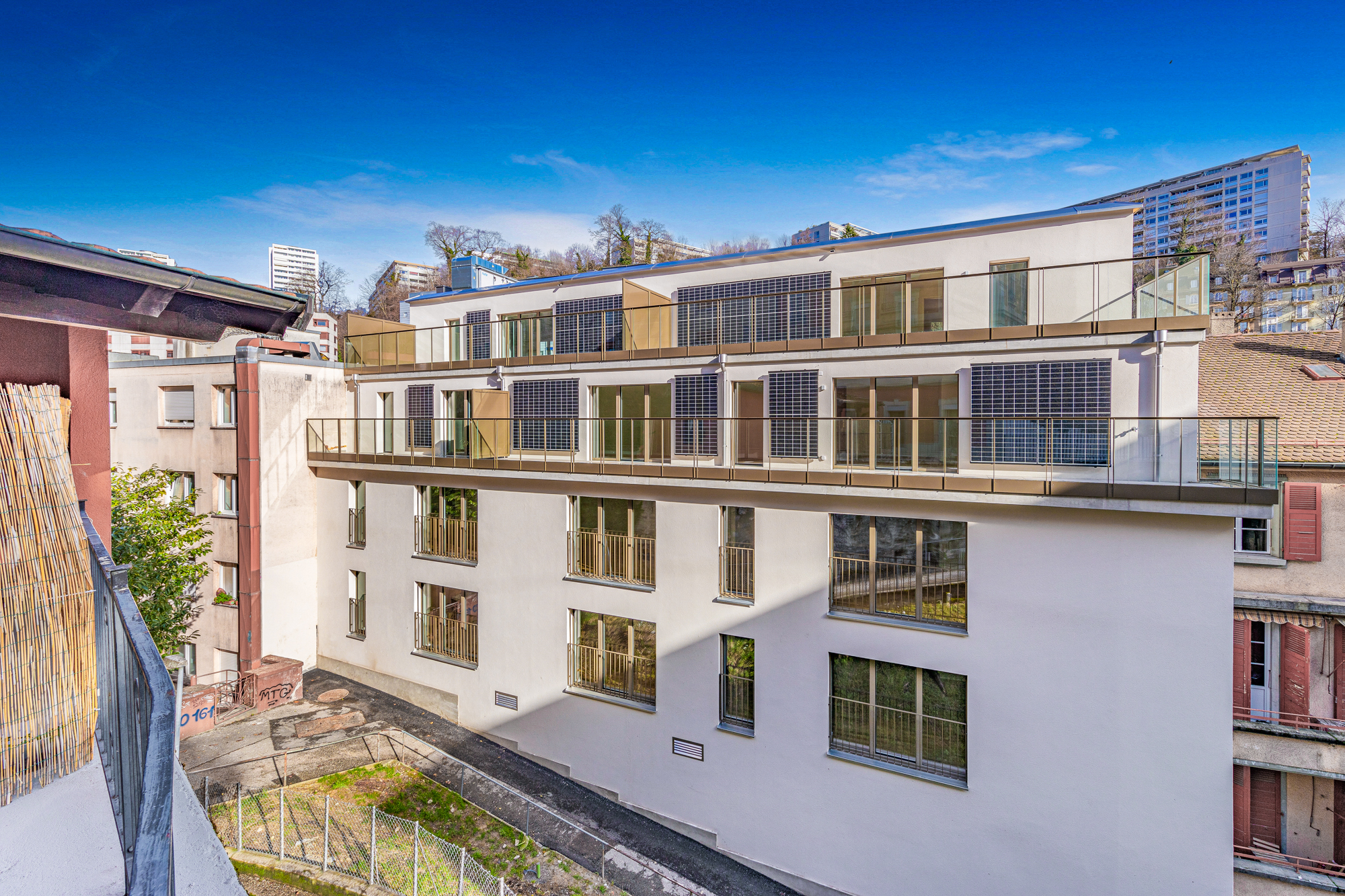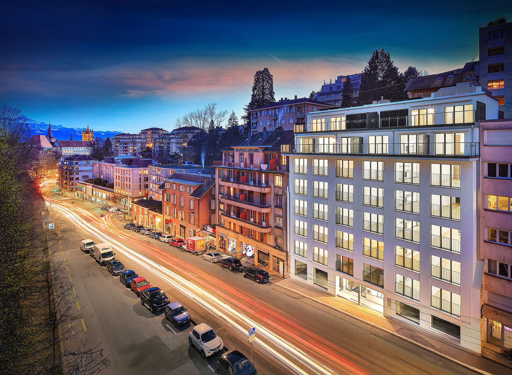 Borde 17 – Au cœur de Lausanne, un nouvel immeuble s’insère dans le tissu dense de la rue de la Borde. A l’arrière, il dialogue avec les crêts de la colline de la Pontaise, tout en intégrant un parcours de mobilité douce.