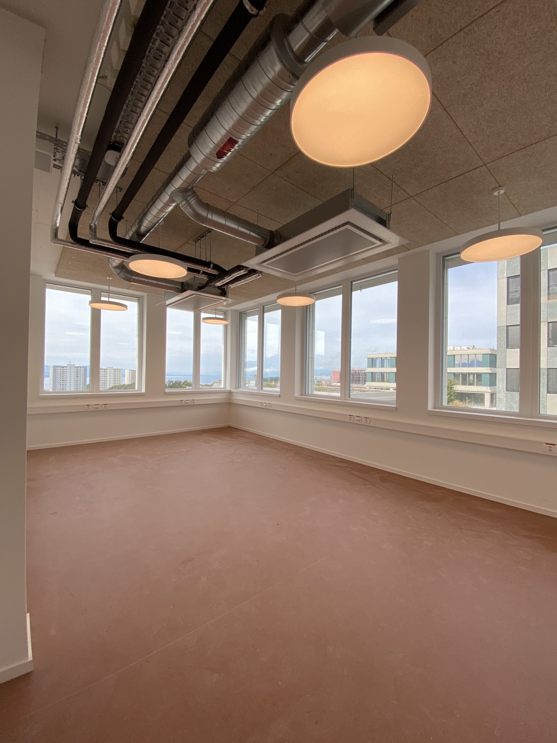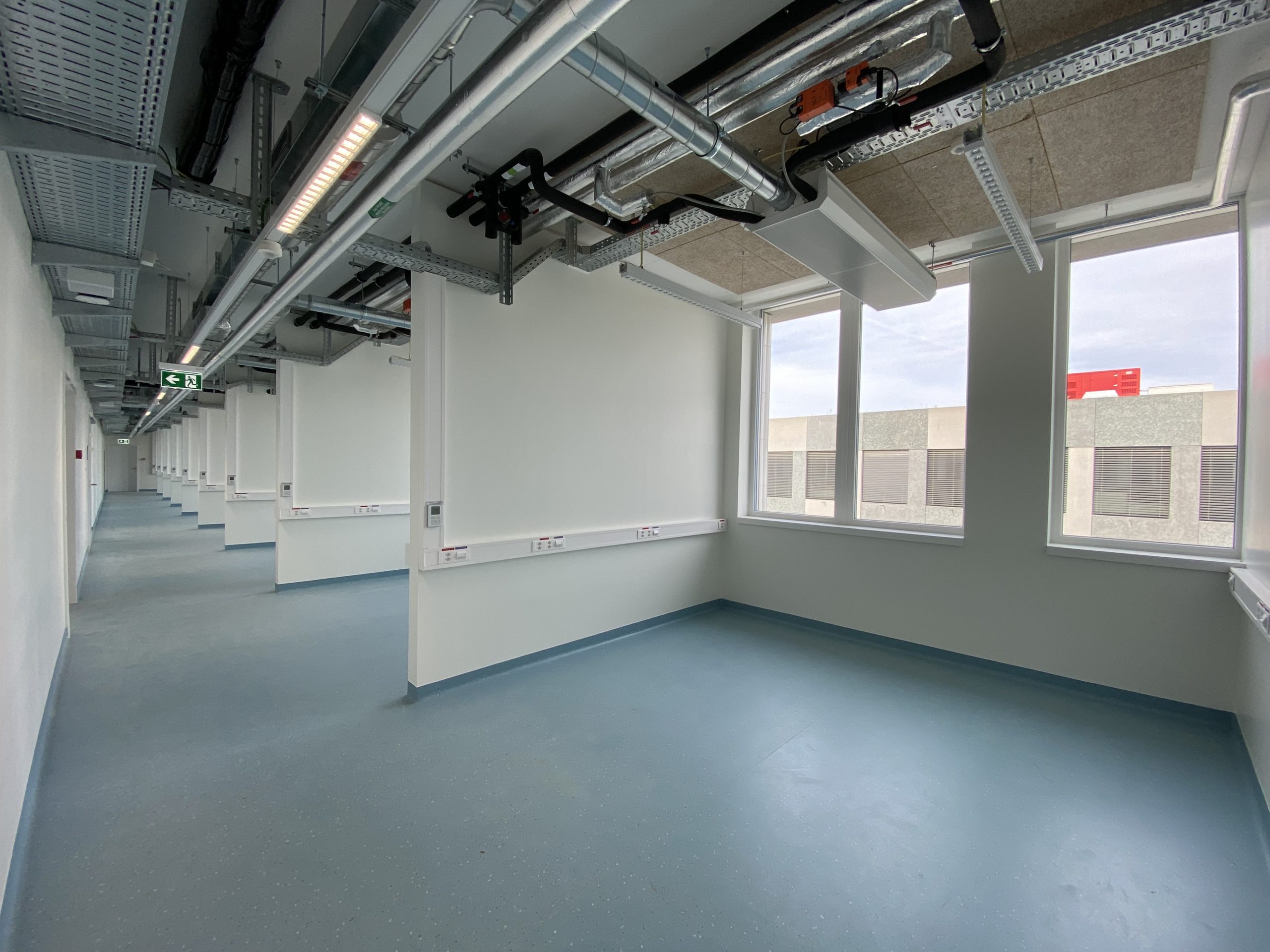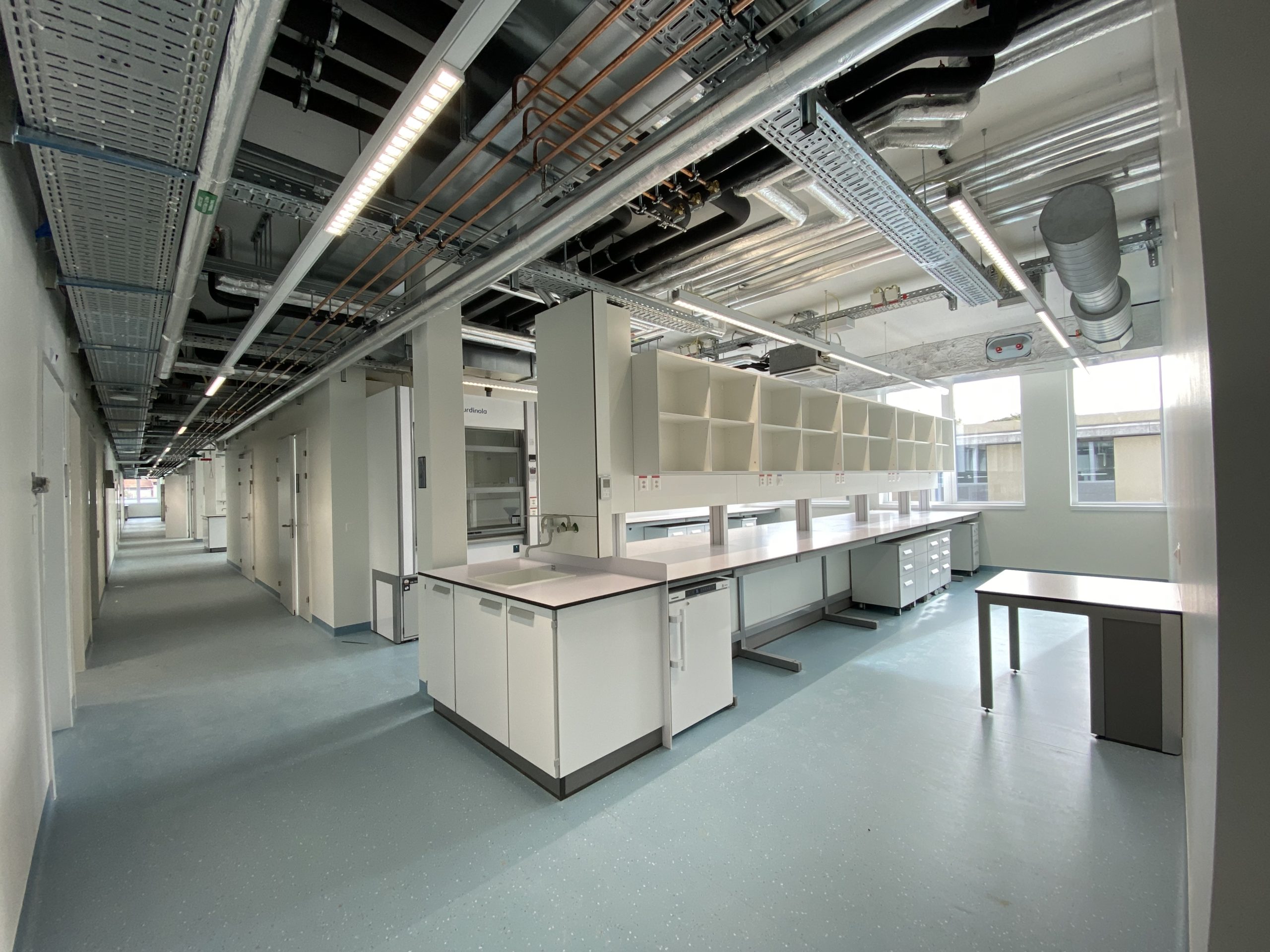 La technique est apparente au plafond dans tout le bâtiment. Alors que des contre-cœurs fermés sont un impératif lié aux équipements et au mode de travail des chercheurs, le vitrage peut courir vers le haut jusqu’à la dalle. Au total, 1500 m2 de vitrages assurent un apport en lumière naturelle optimal à chaque espace. La planification BIM des techniques s’est révélée à ce titre particulièrement précieuse.