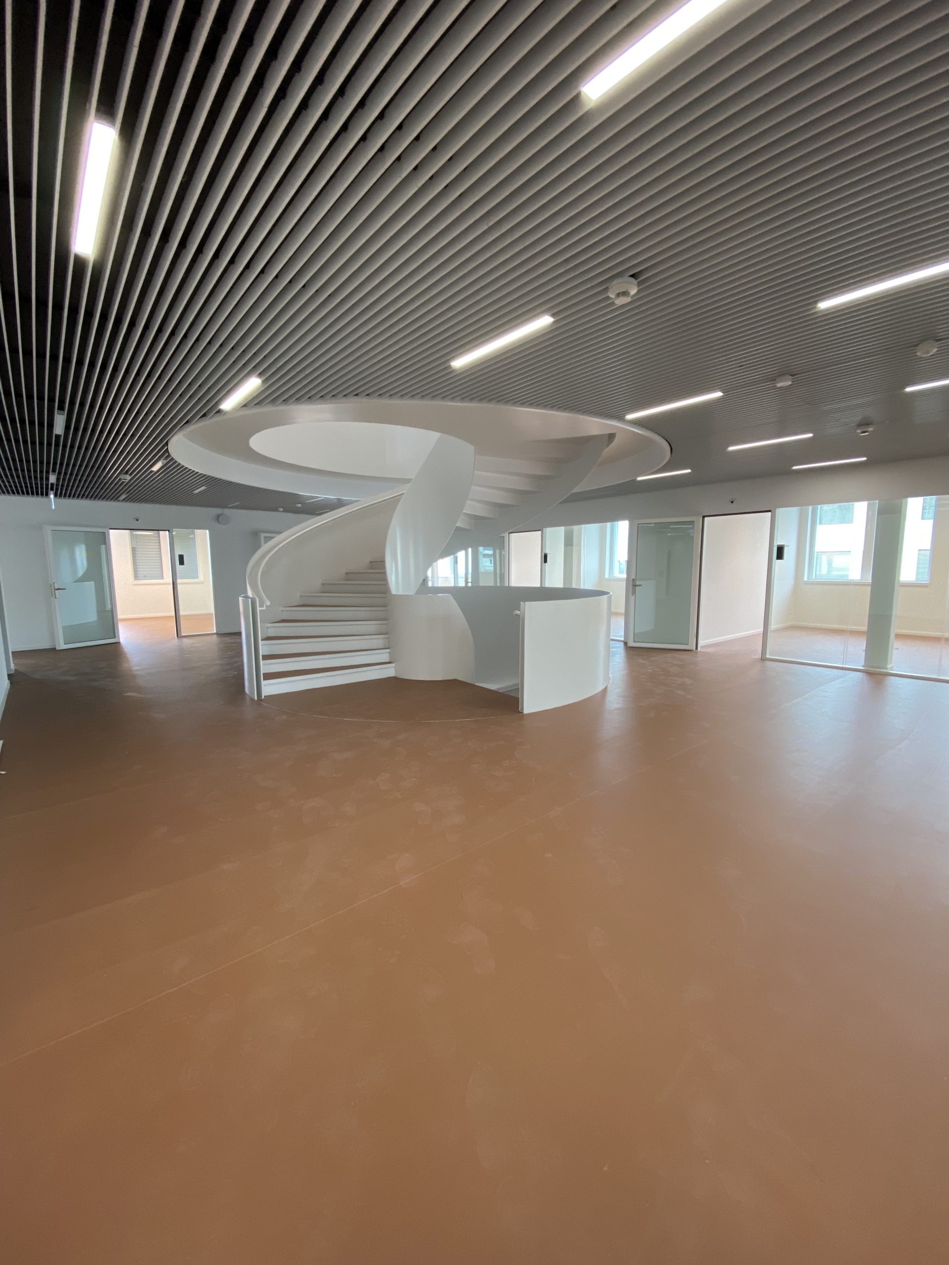 La structure elle-même utilise une combinaison d’éléments traditionnels et préfabriqués pour assurer homogénéité et efficacité. Dans les étages supérieurs, un magnifique escalier hélicoïdal aux airs de molécule d’ADN apporte une touche de fluidité visuelle et symbolise la vision d’un travail d’équipe pluridisciplinaire. Large, blanc, élancé et élégant, il connecte les trois niveaux et favorise la circulation ainsi que les échanges informels.