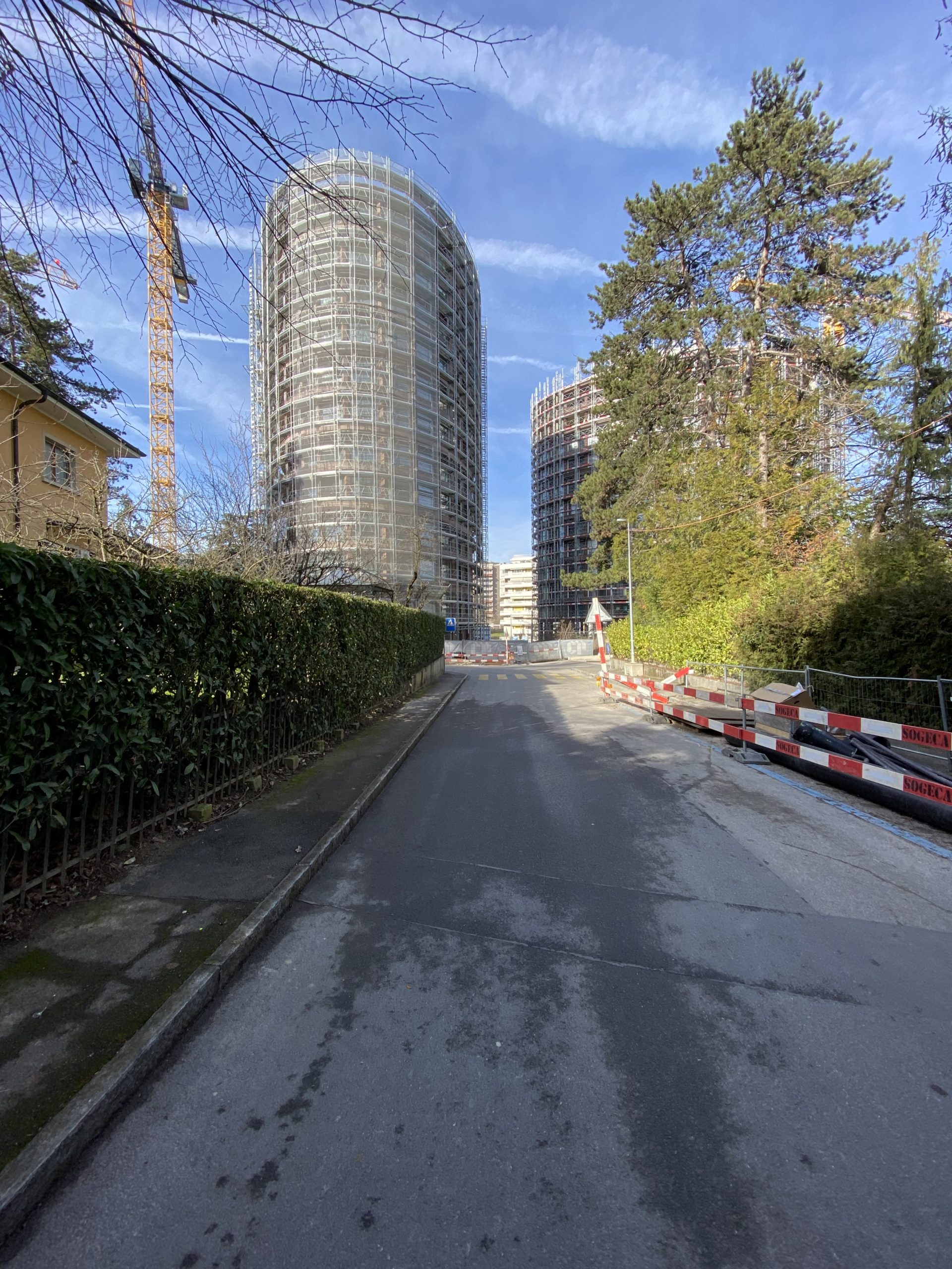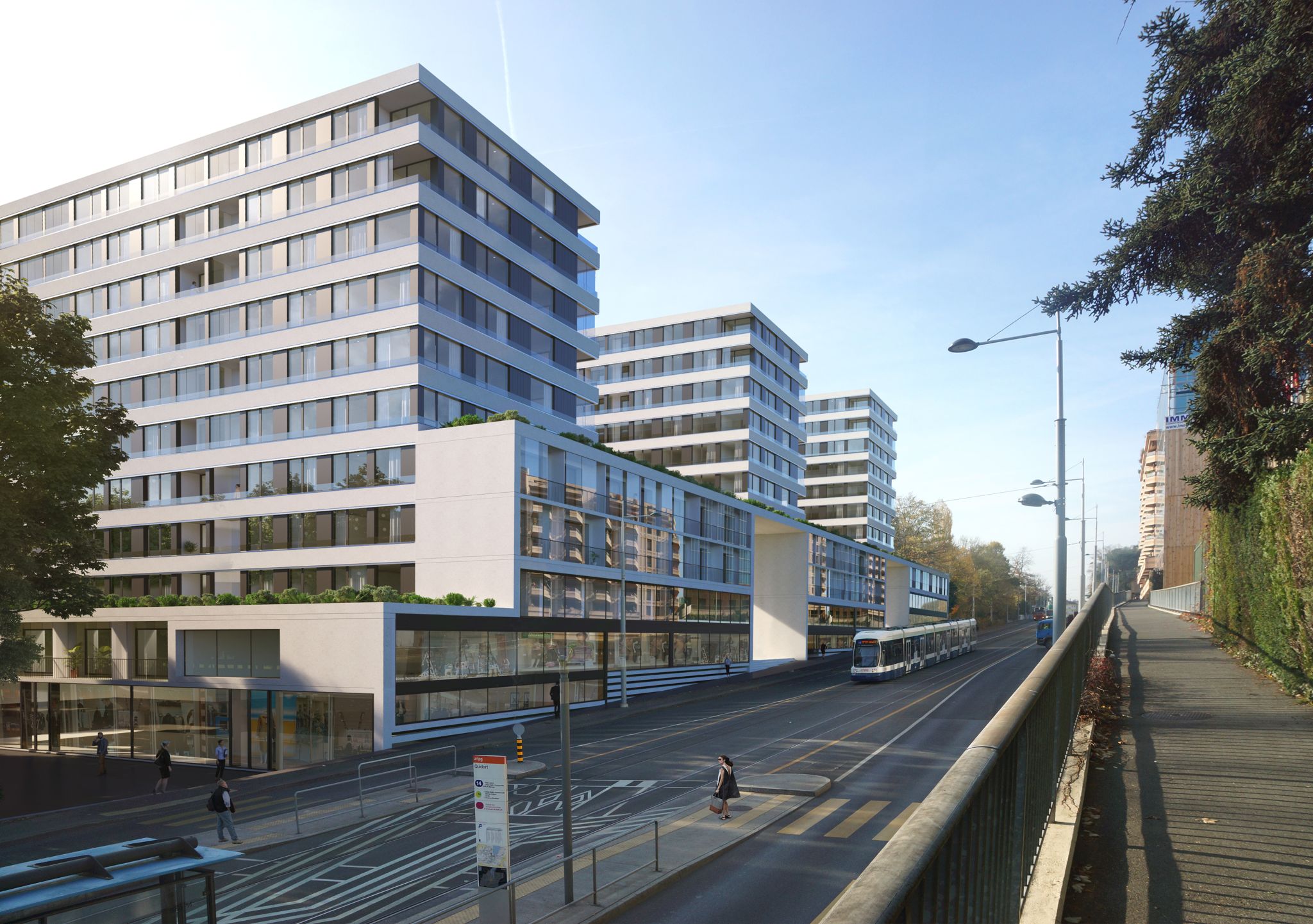 Le long de la Route de Chancy, la construction d’un nouvel ensemble de bâtiments vient de débuter. Ce front bâti est destiné à un programme mixte activités/logements et permet de protéger les futurs appartements situés à l’intérieur du quartier, dans le parc et sur le coteau, dans un contexte très largement arboré. Le projet permet de passer de la logique du jardin privatif à celle d’un grand parc public avec des constructions au cœur de la nature.