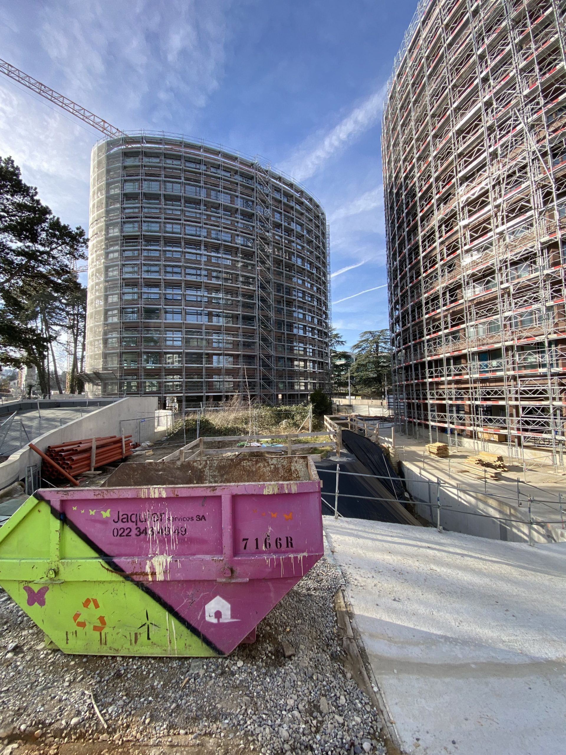 Conçue par group8 architectes, deux tours au plan elliptique font front sur le carrefour Route de Chancy/Route de St-Georges. Élancées et tendues, leurs lignes sont un signal fort pour le site. Pour autant, leur forme arrondie et leur élégance permettent une intégration douce dans ce contexte en mutation.