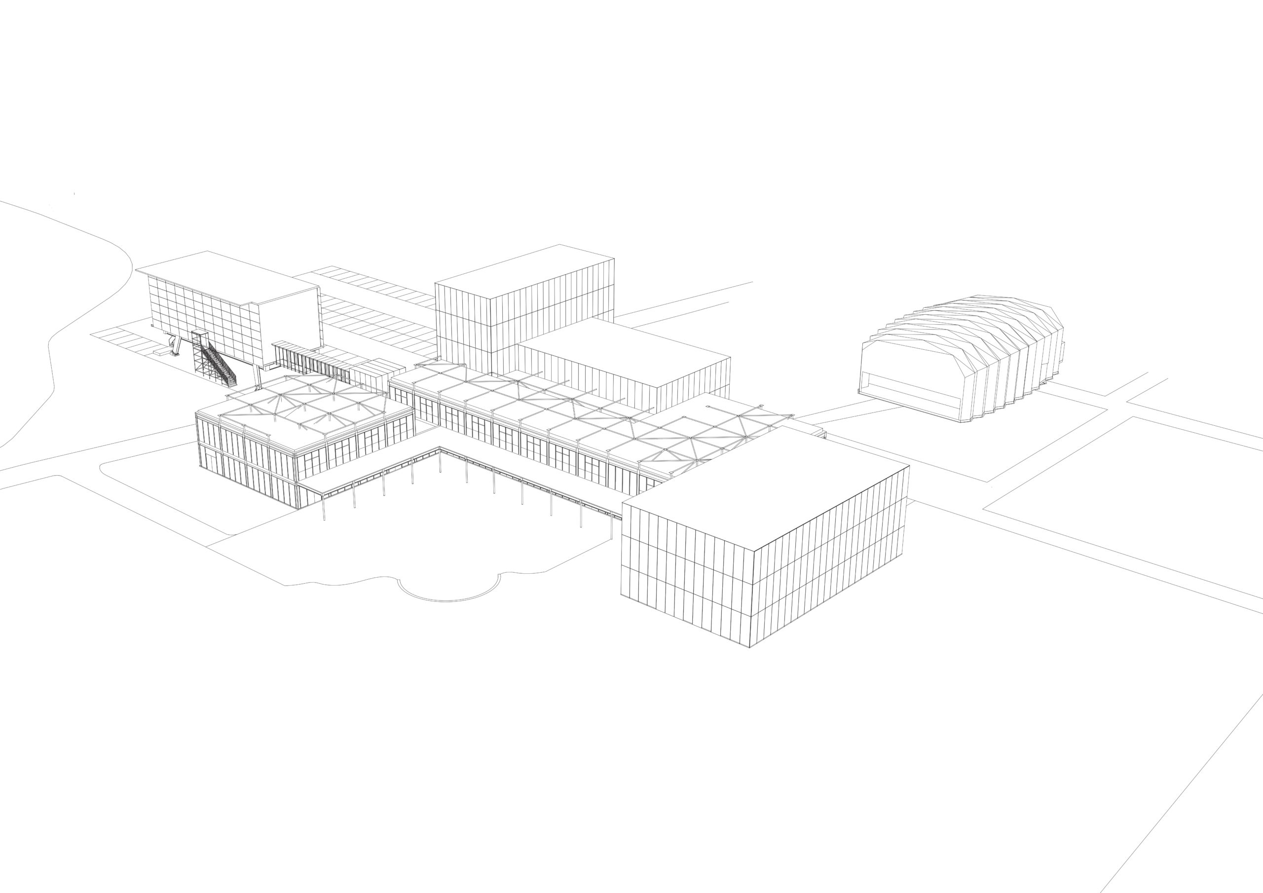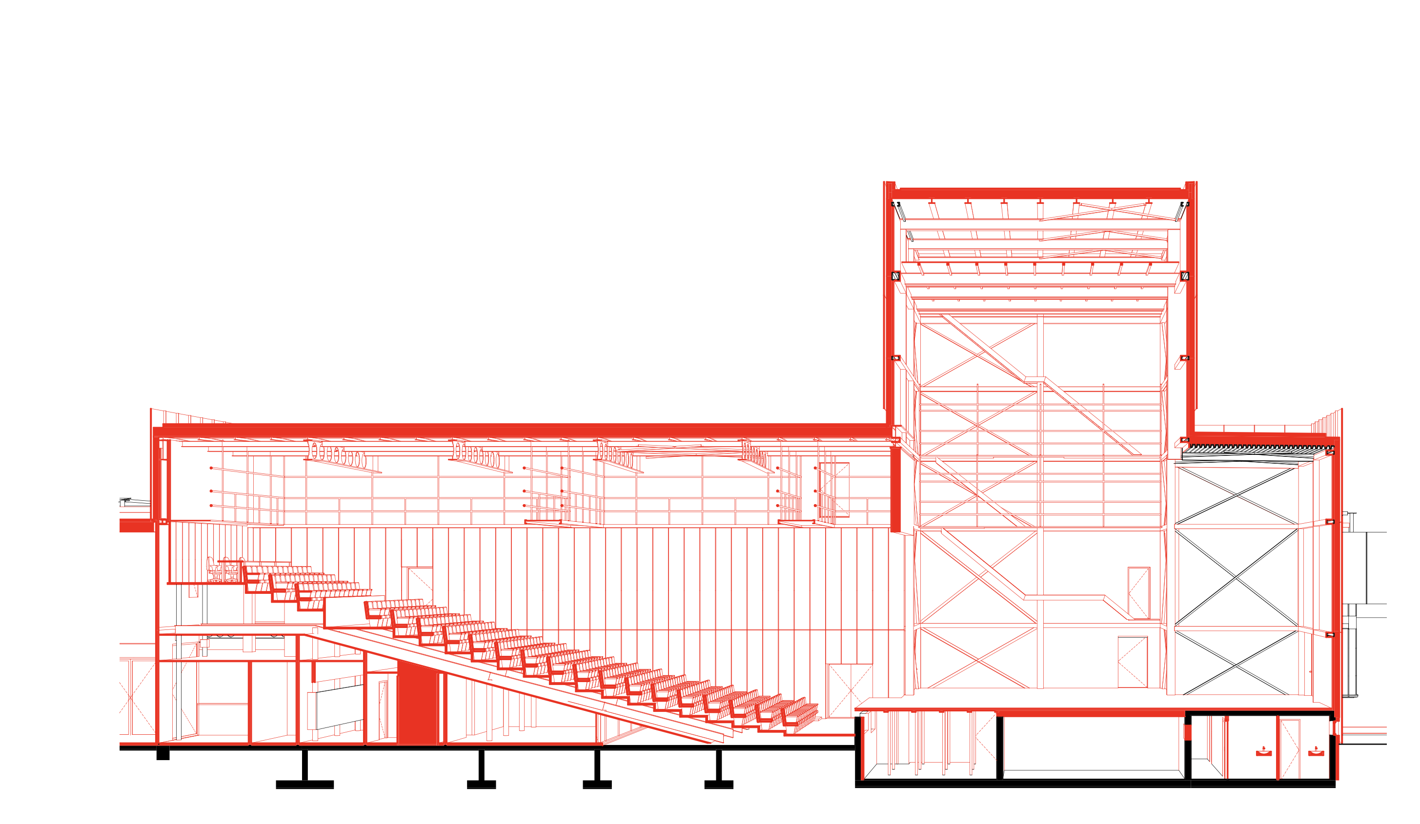 Respectant l’esprit, la trame et la logique du projet de Max Bill, les architectes de Pont12 dessinent une extension côté est. La surface de cette nouvelle salle de répétition est équivalente au plateau de la salle 64. Pour le confort de travail, une fenêtre est ouverte en hauteur côté ouest. Une porte à l’ouest donne directement sur la «Cour des Arts», l’espace extérieur dessiné par le foyer, l’aile des ateliers et la nouvelle salle. Une porte à l’est permet d’introduire les décors. La salle accueille également une grande loge et un local de stockage.