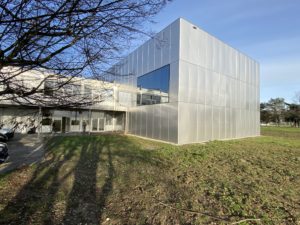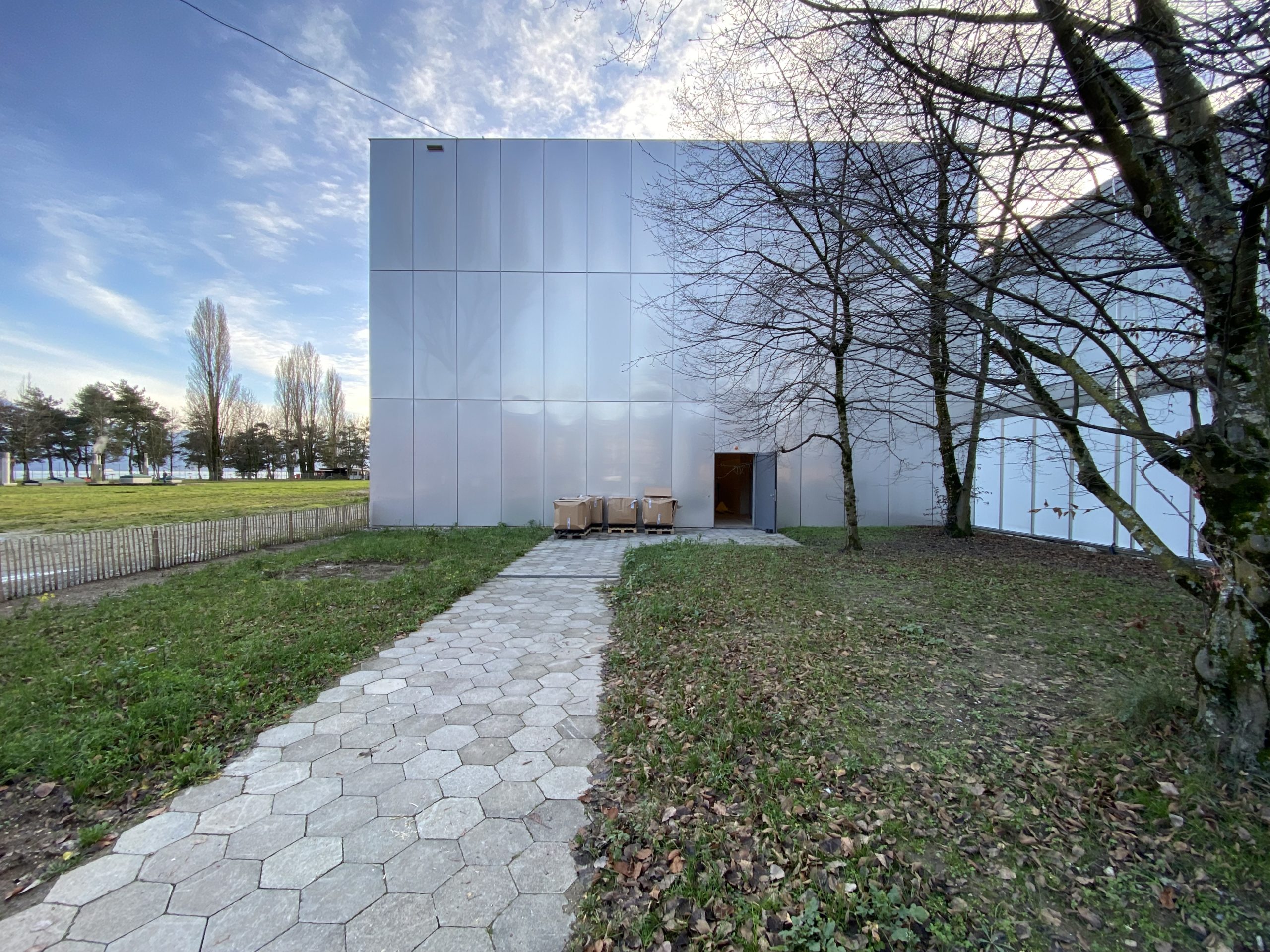 L’enveloppe est habillée des mêmes panneaux en acier inoxydable que ceux de la salle 64. Le foyer, la petite salle 76 – La Passerelle, l’aile nord, l’aile sud ainsi que les aménagements extérieurs ont également bénéficié de travaux d’assainissement. (Théâtre de Vidy)