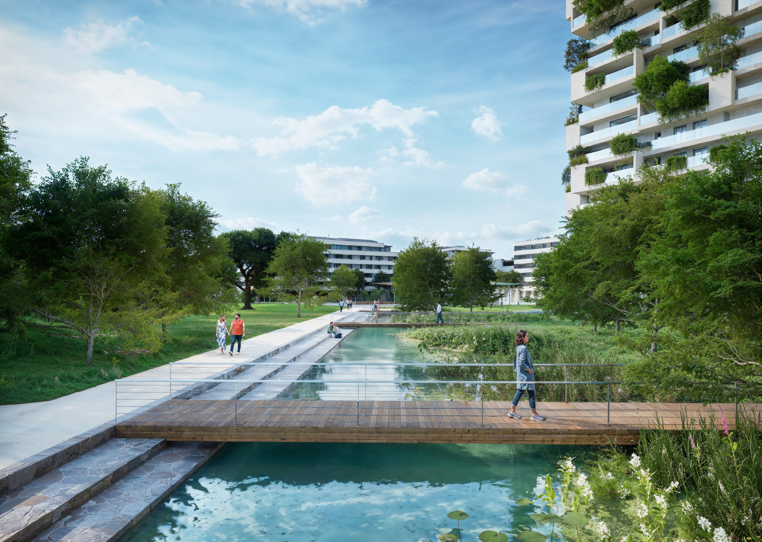 Les surfaces libérées au sol permettent d’aménager un parc de plus de deux hectares. Ici, une forêt urbaine, une grande prairie, des jardins urbains ainsi qu’une place créeront un espace public inédit en Suisse romande et de grande qualité.