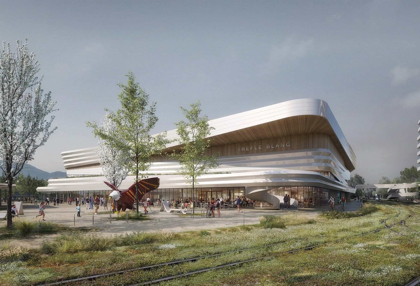 Trèfle Blanc – Au programme : une patinoire principale de plus de 8 600 places, une patinoire secondaire, des espaces VIP, de restauration et d’expositions sur 2 700m², 3 niveaux de parking, un bâtiment tertiaire, et un travail de conception fort sur les aménagements extérieurs et la voie verte de mobilité douce reliant les éléments du programme.